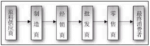 在社會化大生產(chǎn)的前提下,任何商品被制造和被消費的過程,實際上是在多個環(huán)節(jié)、多個商家進行“傳遞”的過程,這一過程構成的“通道”就是“供應鏈”。供應鏈的研究就是從分銷模式開始的。在分銷模式下,最常見的價值傳遞的通道如下圖所示: