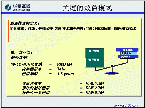 華夏證券經(jīng)紀(jì)業(yè)務(wù)總部的姚磊作為唯一的成功應(yīng)用案例代表,主要是和與會(huì)的金融機(jī)構(gòu)分享在客戶(hù)關(guān)系管理規(guī)劃方面的一些成功經(jīng)驗(yàn)。華夏證券認(rèn)為,對(duì)于證券公司的經(jīng)紀(jì)業(yè)務(wù)來(lái)講,客戶(hù)關(guān)系管理的主要目標(biāo)應(yīng)該是把客戶(hù)關(guān)系管理系統(tǒng)的核心功能融入開(kāi)戶(hù)、交易、服務(wù)、咨詢(xún)等四個(gè)與客戶(hù)互動(dòng)的過(guò)程之中,比如:客戶(hù)資料規(guī)戶(hù)整合形成統(tǒng)一的客戶(hù)號(hào),管理客戶(hù)交易偏好和產(chǎn)品偏好上的變化,配合多種渠道建立一對(duì)一銷(xiāo)售流程,客戶(hù)終身價(jià)值管理。在風(fēng)險(xiǎn)控制方面,華夏證券同樣貢獻(xiàn)了寶貴的經(jīng)驗(yàn),在這方面他們認(rèn)為最重要的方面是要做好高層領(lǐng)導(dǎo)的灌輸和培訓(xùn)工作,讓企業(yè)的高層領(lǐng)導(dǎo)對(duì)于客戶(hù)關(guān)系管理有一個(gè)正確的理解,從而對(duì)于項(xiàng)目的投資有一個(gè)合理的預(yù)期和實(shí)證,通俗一點(diǎn)說(shuō),就是首先為整個(gè)項(xiàng)目找一個(gè)合適的發(fā)起人。第二點(diǎn)要注意,要有專(zhuān)業(yè)的項(xiàng)目管理隊(duì)伍,這其實(shí)就是集成商選擇方面的風(fēng)險(xiǎn)。除此之外,還要對(duì)項(xiàng)目要有一個(gè)明確的定義,關(guān)注每一步提交的結(jié)果,在項(xiàng)目過(guò)程中就隨時(shí)發(fā)現(xiàn)問(wèn)題、解決問(wèn)題。