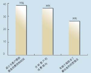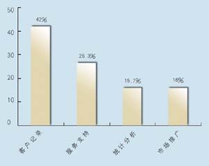 關(guān)于所應(yīng)用的CRM類型,有5家是呼叫中心,5家是分析型,7家是運(yùn)營型,2家是屬于大型企業(yè)CRM。其中13家擁有動態(tài)客戶數(shù)據(jù)庫,占到68.4%。這其中又有42%利用數(shù)據(jù)庫作客戶記錄,26.3%作為客戶支持使用,15.7%用作統(tǒng)計(jì)分析,另有16%作為市場推廣。保險(xiǎn)公司與客戶聯(lián)系的方式,從重要性來看依次為:面對面\電話\網(wǎng)絡(luò)\傳真,這說明保險(xiǎn)公司對于與客戶進(jìn)行人性化交流的重視。在問到CRM的主要作用時(shí),有5家表示使用CRM有助于保險(xiǎn)業(yè)了解自身的經(jīng)營情況,幫助公司準(zhǔn)確地發(fā)現(xiàn)贏利客戶和具有贏利潛力的客戶,有7家認(rèn)為使用CRM有助于分析客戶的消費(fèi)傾向,有7家認(rèn)為使用CRM有助于優(yōu)化信息和資源管理。在問到是否愿意為像CRM系統(tǒng)這樣的咨詢或服務(wù)付費(fèi)時(shí),有11家表示愿意,占到57.8%。