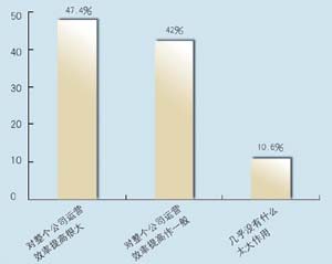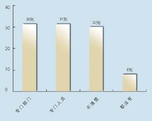 在問到實(shí)施周期上,有9家表示希望在3個(gè)月內(nèi)完成,占到47.4%,有6家接受3~6個(gè)月的周期,超過6個(gè)月的周期已經(jīng)顯得太長。在問到CRM的實(shí)施效果上,有9家認(rèn)為對公司運(yùn)營效率有很大提高,8家認(rèn)為作用一般,只有2家認(rèn)為沒有作用。表明基本上企業(yè)認(rèn)可CRM的作用。在問到是否有專門人員負(fù)責(zé)CRM時(shí),有6家表示有專門部門,有6家有專門人員,合計(jì)占62%,說明企業(yè)非常重視CRM的應(yīng)用。