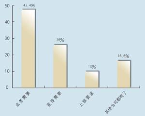 在問到對CRM的熟悉程度方面,有12家表示熟悉,占到63.2%,另有7家表示不熟悉,說明許多企業(yè)已經(jīng)對CRM有一定了解,不過也仍有相當(dāng)大的市場空間。其中有8家建立了CRM系統(tǒng),占到42%,計(jì)劃建立的有9家,占到47.4%,而有2家表示短期不會建立。從調(diào)查發(fā)現(xiàn),幾乎所有受訪者都接受和認(rèn)同CRM,盡管有一些企業(yè)還不熟悉,但在調(diào)查問卷中對此表現(xiàn)出極大的興趣。在CRM的采購動機(jī)上,有9家表示是為了提高業(yè)務(wù),占到將近一半的比例(47.4%),而有5家表示出于企業(yè)宣傳,2家屬于上級主管部門要求,有3家表示是出于同行的示范。調(diào)查顯示,企業(yè)獲得CRM的信息來源很廣,最多的是通過報(bào)刊雜志的廣告,有6家,占31.6%,而上級推薦和供應(yīng)商推薦各有4家,各占21%,有兩家是集成商推薦,此外還有3家通過展會獲得相關(guān)信息。