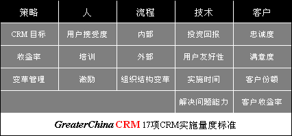 GreaterChinaCRM提出了一組量度標準(五個范圍共17項),不僅覆蓋了軟件/技術(shù)方面的回報,也綜合包括了策略,人,流程,技術(shù)和客戶。這些量度標準告訴我們應(yīng)當如何看待和評估CRM的實施。讓我們來看一下: