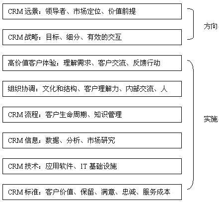 對于大多數(shù)公司而言,一個產(chǎn)品戰(zhàn)略很好理解。但是CRM戰(zhàn)略卻不太讓人理解。這是因?yàn)樵贑RM產(chǎn)業(yè)界、學(xué)術(shù)界對"CRM是什么"、"CRM戰(zhàn)略由什么組成"還沒有達(dá)成共識。因此,以下所闡述的CRM戰(zhàn)略并不一定勝人一籌,但我們會努力全面論述CRM戰(zhàn)略框架。我們認(rèn)為一個CRM戰(zhàn)略必須包括以下幾個內(nèi)容:定義價值前提、定義客戶戰(zhàn)略、企業(yè)變革計劃。