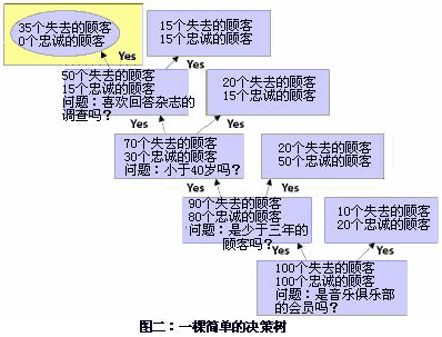 你可以從它的名字中猜到,決策數(shù)是一種樹型分析模型。樹枝代表了用來定義或者細分客戶的不同問題。比如,假設一家音樂俱樂部想要分析為什么一些會員不會再次申請它的會員資格(該俱樂部會員采取月申請制)。為了形成決策樹,公司召集了一批由100個忠誠顧客、100個非忠誠或者已經公司已經失去的顧客組成的測試小組。然后,公司開始提出一系列問題,要求顧客形容一下忠誠的顧客和非忠誠的顧客是什么樣子的。整個決策樹就如圖二所示。