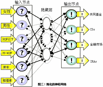 假設該集團的數(shù)據組包括了100000個現(xiàn)有和潛在的顧客。數(shù)據組中所有成員至少滿足一個列示于每個輸出節(jié)點邊上的特征條件,比如說,他們的年齡小于35歲或者是在35-40之間,男性或者女性,房東或者租借人。BPN從所有的輸入節(jié)點中獲得數(shù)據,并且以此編譯一個預測型模型。這個簡單的模型告訴使用者,年齡在35-40歲之間的男性房東最有可能購買共同基金和金融市場產品。這是BNP能預測的信息。