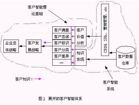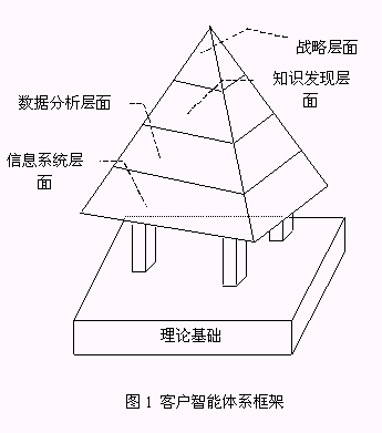 客戶智能系統(tǒng)(CI System)是本文提出的實(shí)現(xiàn)客戶智能的系統(tǒng)平臺(tái)。它包括了客戶智能體系中的信息系統(tǒng)層面、數(shù)據(jù)分析層面、知識(shí)發(fā)現(xiàn)層面,是基于客戶智能理論的可操作的系統(tǒng)框架。因此,客戶智能體系也可以簡(jiǎn)單地用客戶智能基礎(chǔ)理論和基于客戶智能理論的客戶智能系統(tǒng)兩個(gè)邏輯層面表示(圖2)。基于客戶智能的CRM系統(tǒng)是本文描述的客戶智能系統(tǒng)中的一種。