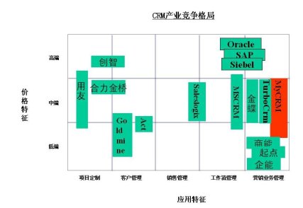 伴隨著中國CRM市場的逐步繁榮,CRM產(chǎn)業(yè)競爭格局已然悄然改變。國內(nèi)廠商的更替變化,國外廠商的步步進(jìn)逼,一幕幕不斷上演。變化的背后,沒有顯見的是激烈競爭角逐;改變帶來的亦是對(duì)市場發(fā)展的積極推動(dòng)。記得,在2005年以前,在市場中活躍的廠商基本都是中國本土的,而且總是那幾個(gè)老面孔。適者生存,中國CRM市場經(jīng)歷了6個(gè)年頭的洗禮后,現(xiàn)在的產(chǎn)業(yè)競爭格局,已經(jīng)逐步明朗起來。我個(gè)人從2個(gè)緯度來定位,即:價(jià)格特征、產(chǎn)品應(yīng)用特征。從價(jià)格特征來看,有高端、中端和低端。從產(chǎn)品應(yīng)用特征來看,有項(xiàng)目定制、客戶管理、銷售管理、工作流管理和營銷業(yè)務(wù)管理。如下圖所示。營銷業(yè)務(wù)管理則涵蓋了客戶管理、市場管理、銷售管理和服務(wù)管理的應(yīng)用。目前,中國本土CRM廠商,大多數(shù)都在致力于把營銷業(yè)務(wù)管理做好。不過,從具體的產(chǎn)品功能和應(yīng)用深度,以及產(chǎn)品客戶化能力方面,各廠商的優(yōu)劣勢還是非常明顯的。這也是,企業(yè)在選型CRM產(chǎn)品的時(shí)候,非常重視的一些關(guān)鍵評(píng)估指標(biāo)。但是,廠商要實(shí)現(xiàn)全面的功能、深度的應(yīng)用以及強(qiáng)大的客戶化能力,是需要付出很高的研發(fā)投入的,而且也需要較長的一段產(chǎn)品化的周期。這似乎是一個(gè)很難逾越的門檻,尤其是對(duì)于中國本土的CRM廠商來說,更是如此。因?yàn)椋Y金和人才資源畢竟是相當(dāng)有限的。所以,眾多CRM廠商中,真正能夠獲得客戶青睞,幫助客戶實(shí)現(xiàn)企業(yè)級(jí)CRM應(yīng)用的一線廠商,也許只是少有的幾家了。目前,MyCRM、saleslogix、TurboCRM以及MSCRM等,都是客戶不錯(cuò)的選擇。