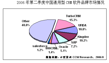 計世資訊(CCW Research)數(shù)據(jù)顯示,2006年二季度中國CRM軟件市場規(guī)模達2.25億元人民幣,比去年同期增長20.1%,其中通用型CRM軟件市場規(guī)模為0.80億元,占總體CRM市場份額的35.5%。