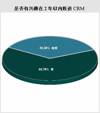 在選擇“尚未使用任一CRM軟件”的被調(diào)查者中,當(dāng)被問(wèn)及基于現(xiàn)在的狀況,“是否有興趣在兩年以內(nèi)投資CRM”。有64.70%的被調(diào)查者選擇有興趣在兩年內(nèi)投資CRM軟件,而選擇沒(méi)有興趣在兩年內(nèi)投資CRM軟件的只占35.30%。盡管現(xiàn)在實(shí)際使用CRM軟件的用戶所占比例還不甚理想,但市場(chǎng)前景還是非?春,大部分公司具有實(shí)施CRM軟件的需求。