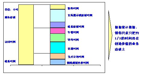 銷售資源是有限的,如何合理分配資源并確保最大的客戶機(jī)會和客戶價(jià)值是一個(gè)關(guān)鍵的問題。對于銷售代表,個(gè)人的時(shí)間是寶貴的資源。根據(jù)統(tǒng)計(jì)數(shù)據(jù),銷售人員只把約1/3的時(shí)間用于增值的業(yè)務(wù)洽談上,這意味著在銷售人員的時(shí)間管理上有很大的提升空間。如圖3-1所示。