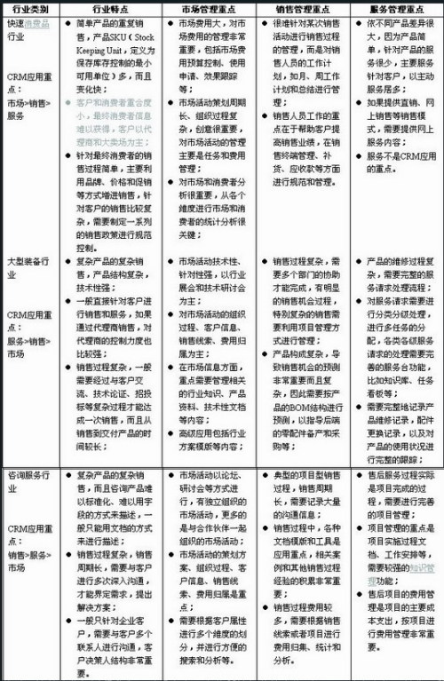 從以上簡單的分析過程我們可以看出由于企業(yè)所處行業(yè)特點的不同,導(dǎo)致在市場、銷售和服務(wù)方面對CRM主要功能需求差別非常大。企業(yè)在實際選型過程中,還需要對行業(yè)再進行細(xì)分分析,比如在快速消費品中,洗滌用品行業(yè)和牛奶乳業(yè)行業(yè)在客戶服務(wù)的主要需求等方面就有比較大的差別,這些都需要細(xì)致的分析。