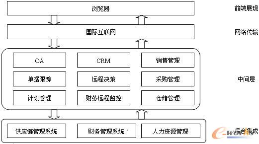 中間層:是實現具體的應用功能的層次,包括銷售、采購、倉儲管理、遠程審批/監(jiān)控/決策等;