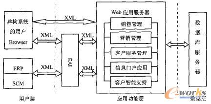 包括ERP、SCM等其他企業(yè)應用在內的所有的系統(tǒng)用戶與應用功能層的數(shù)據(jù)交換均通過XMI數(shù)據(jù)進行傳輸,從而大大減小了各種企業(yè)應用系統(tǒng)間的通信阻力,為EAI提供了良好的通信平臺。Web用戶的客戶端只是“瘦小的”瀏覽器日_數(shù)量不受限制,不需要安裝專門的軟件,這使得凡可以接入Internet的用戶都可以方便、靈活地使用系統(tǒng),大大提升了系統(tǒng)用戶間溝通、協(xié)作的效率。此外,由于CRM應用系統(tǒng)是在中央服務器上實施和維護的,對客戶端的要求遠沒有C/S結構那么高,集中的軟件實施和維護大大節(jié)約了企業(yè)的運行成本和維護費用。圖1描述的是筆者所要闡述的適應網絡環(huán)境的基于Web的系統(tǒng)平臺架構,這并不意味著CRM應用系統(tǒng)完全以這種方式運行,事實上用戶接入CRM系統(tǒng)的方式是多種多樣的,系統(tǒng)還應該提供電話、傳真、無線接入等多種接入接口。