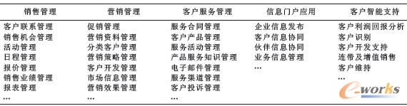 CRM應用系統(tǒng)功能平臺對應于平臺架構中的應用功能層,是系統(tǒng)平臺的卞體部分。基于對A企業(yè)的需求分析及B/S的平臺架構特點,筆者將系統(tǒng)功能綜合歸納為銷信管理、營銷管理、客戶服務管理、信息門戶應用及客戶智能支持5大模塊,它們共同構成的系統(tǒng)的功能平臺如圖2所示,詳細功能設計如表1所示。