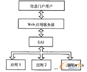 。3)用戶界面層整合。用戶獲得某項業(yè)務活動所需的信息可能需要在多個應用的不同的用戶界面來回切換,在實現(xiàn)數(shù)據(jù)層和業(yè)務功能層整合的基礎上,用戶界面層有必要也有可能實現(xiàn)使用統(tǒng)一界面完成應用間集成的功能。A企業(yè)信息門戶應用就是一個以用戶界面層整合為卞的整合實例,其邏輯結構如圖3所示。