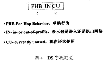 Diff-Serv比Int-Serv 更具可擴展性,如圖3所示,它可用于企業(yè)的廣域網中,并在運營商網絡中發(fā)揮重要的作用,因為它可以根據應用或業(yè)務類型排出不同的優(yōu)先級別。業(yè)務區(qū)分結構使用IPv4報頭中的業(yè)務類型(ToS)字段,并將8 位ToS字段重新命名,作為DS字段,其中6位可供目前使用,剩余2位以備將來使用,如圖4所示。通過該字段的標記,下行節(jié)點可以獲取足夠的服務質量信息,以對到達該端口的數據包做出相應的“處理”,將它們正確地轉發(fā)給下一跳的路由器。這里需要注意, ToS字段和DS字段的定義是不同的。邊緣路由器可以將ToS字段映射到DS字段。