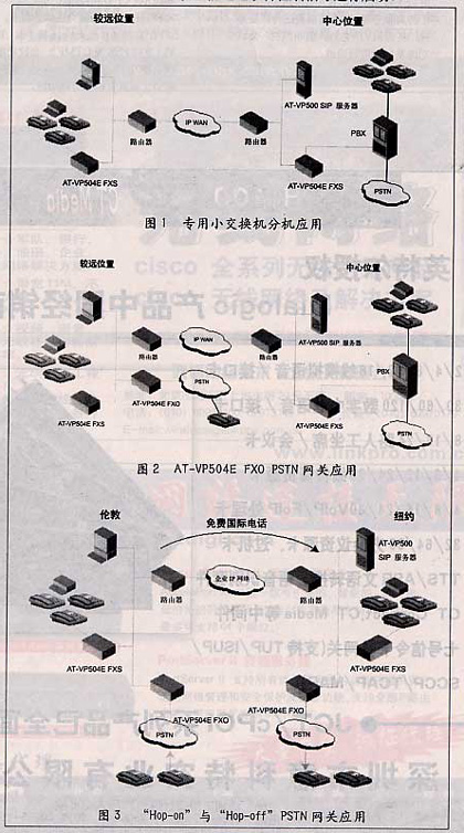 在圖2所示的應(yīng)用中,遠程局位置直接附加了一個AT-VP504E FXO裝置,為PSTN提供IP電話網(wǎng)關(guān)服務(wù),IP語音呼叫被轉(zhuǎn)化為模擬格式通過標(biāo)準(zhǔn)電話線路進行傳輸。同樣,來自普通電話網(wǎng)絡(luò)的呼入呼叫,也被轉(zhuǎn)化為IP呼叫通過企業(yè)IP網(wǎng)絡(luò)轉(zhuǎn)接。這就使本地PSTN呼叫者,可向企業(yè)或其他目的地打免費長途電話。