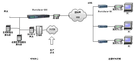 呼叫中心和代理之間傳輸可以選用寬帶高速ADSL網(wǎng)絡(luò),構(gòu)成以一個(gè)呼叫中心和眾多遠(yuǎn)端通信的綜合語音/數(shù)據(jù)VPN網(wǎng)絡(luò)。VoIP/Data ADSL VPN網(wǎng)絡(luò)是呼叫系統(tǒng)的解決辦法,它要求系統(tǒng)的性能好,穩(wěn)定性和可靠性高,語音質(zhì)量好, 響應(yīng)時(shí)間短,網(wǎng)絡(luò)配置和維護(hù)簡單方便。