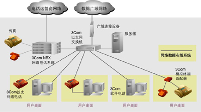 SuperStack 3 NBX V5000交換系統(tǒng)作為網(wǎng)絡(luò)話音核心交換系統(tǒng),該系統(tǒng)內(nèi)置了自動話務(wù)員、語音消息系統(tǒng)等。而桌面則采用3Com 10/100Mbps以太網(wǎng)絡(luò)電話終端,同時采用3Com