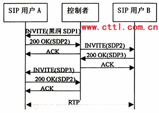 該流程中,控制者首先向用戶A發(fā)送INVITE,包含SDP1,用來創(chuàng)建一個(gè)初始的“黑洞”媒體流,A振鈴并產(chǎn)生應(yīng)答記為SDP2,其中包含的是一個(gè)有效的連接地址,但此時(shí)仍沒有媒體流向控制者?刂普呦駻發(fā)出ACK。