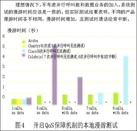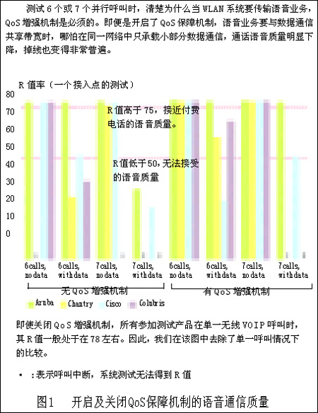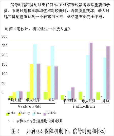 而當我們通過一個接入點或交換機傳送6到7個并行VoIP呼叫時,尤其是加入了數(shù)據(jù)通信業(yè)務后,所有產(chǎn)品的系統(tǒng)性能顯著降低。另外,當開通7個并行VoIP呼叫和關(guān)閉QoS保障機制時,即使沒有加入數(shù)據(jù)業(yè)務, Colubris設備也幾乎都處于通話中斷的狀態(tài)。因此,我們無法得到任何測試數(shù)據(jù)(如圖1所示)。