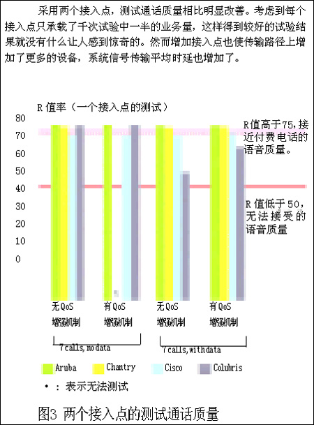 而其他供應商的設備在開啟QoS保障機制的情況下,一旦加入數(shù)據(jù)流業(yè)務,就很難保證通話質(zhì)量。從正面來看,在只有語音傳輸業(yè)務的情況下,QoS保障機制一般運行較好。當我們只承載語音傳輸時,所有系統(tǒng)的音頻質(zhì)量都改善了。在不加入數(shù)據(jù)流情況下測試6個或7個并行VoIP呼叫,所有的系統(tǒng)都能夠取得和付費電話一樣的通話質(zhì)量。但當我們加入數(shù)據(jù)流業(yè)務,一切都改變了。在承載6個并行VoIP呼叫并加入數(shù)據(jù)流業(yè)務的情況下,Colubris CN1250系統(tǒng)的R值衰落到70以下。根據(jù)ITU的R值標準,這說明一些用戶的通話質(zhì)量不令人滿意。Chanrty的R值在60左右,這個結(jié)果將不能令用戶滿意。除了客觀的R值評分以外,我們還進行了一些主觀的通信質(zhì)量監(jiān)聽,當加入了數(shù)據(jù)流業(yè)務以后,我們聽到了大量的回聲,掉線頻繁?傊灰獪y試點加入數(shù)據(jù)業(yè)務流,上面描述的情況就會出現(xiàn),通話質(zhì)量通常變得惡劣。