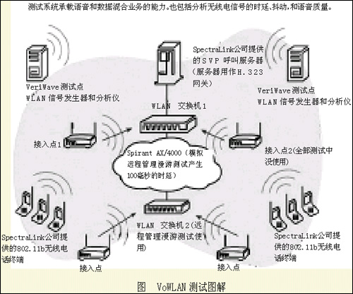 這次試驗搭建了有著自己鮮明特點的VoWLAN試驗系統(tǒng)。該系統(tǒng)包括兩個802.11b接入點適配設備和一部連接到接入點的交換機以及路由設備,還有14個WLAN手持終端設備和SpectraLink公司提供的SVP呼叫服務器(服務器用做H.323網(wǎng)關(guān))。另外,VeriWave公司提供了實驗的測試設備。我們還在漫游測試項目中使用了由Spirent公司提供的信號損傷發(fā)生器。