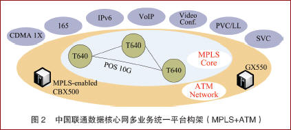 中國聯(lián)通IP電話網(wǎng)的承載網(wǎng)分為核心層和區(qū)域?qū)觾杉壗Y(jié)構(gòu),核心層由北京、上海、廣州、沈陽、武漢、西安和成都7個大區(qū)節(jié)點組成;區(qū)域?qū)影锤鞣止緟^(qū)域分布情況,劃分為22個區(qū)域。建網(wǎng)初期,承載網(wǎng)采用ATM+IP/VPN組成IP電話專用傳輸網(wǎng),確保IP承載層的QoS,網(wǎng)絡(luò)性能符合聯(lián)通測試指標。下一階段,中國聯(lián)通數(shù)據(jù)核心網(wǎng)的技術(shù)演進路線方向如圖2所示。網(wǎng)絡(luò)將以MPLS+ATM為核心技術(shù),在7大核心節(jié)點建設(shè)功能強大的MPLS核心網(wǎng)絡(luò),同時采用2層MPLS技術(shù),實現(xiàn)與ATM設(shè)備的透明連接,從而構(gòu)建一個多協(xié)議、多業(yè)務(wù)同時兼顧IPv4/IPv6發(fā)展的先進網(wǎng)絡(luò)。中國聯(lián)通的互聯(lián)網(wǎng)、數(shù)據(jù)專線、IP電話、視頻會議、IPv6網(wǎng)絡(luò)、CDMA1X數(shù)據(jù)通信網(wǎng)等都承載在統(tǒng)一的數(shù)據(jù)傳送平臺之上。