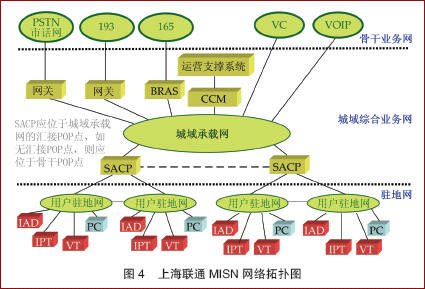 上海聯(lián)通MISN由5個部分組成(見圖4):(1)業(yè)務(wù)接入控制設(shè)備(SACP)。從用戶駐地網(wǎng)到城域網(wǎng)和骨務(wù)都必須通過SACP接的接入認證、業(yè)務(wù)接入控制、網(wǎng)絡(luò)資源管理和服務(wù)質(zhì)量控制等。(2)呼叫管理控制模塊(CCM)。該模塊負責對用戶注冊的管理;通過SACP對業(yè)務(wù)接入進行認證和控制;與骨干業(yè)務(wù)網(wǎng)GK互通,完成各種業(yè)務(wù)的呼叫控制;與SACP一起采集計費信息;負責控制語音和視頻媒體流的接入。(3)業(yè)務(wù)網(wǎng)關(guān)。聯(lián)通MISN是基于IP的分組網(wǎng),與基于電路交換的193長途電話骨干網(wǎng)和本地PSTN市話網(wǎng)互通時,由于媒體層面和控制信令層面都不同,因此,需要通過網(wǎng)關(guān)進行互通。(4)BRAS設(shè)備。負責將互聯(lián)網(wǎng)接入到165網(wǎng)。(5)業(yè)務(wù)運營支撐系統(tǒng)。該系統(tǒng)包括維護網(wǎng)管系統(tǒng)、用戶終端管理系統(tǒng)、用戶管理(業(yè)務(wù)受理、用戶信息管理、用戶業(yè)務(wù)授權(quán)與認證)以及本地MISN的計費/營賬系統(tǒng),其對上的接口是各骨干業(yè)務(wù)網(wǎng)的運維支撐系統(tǒng)。