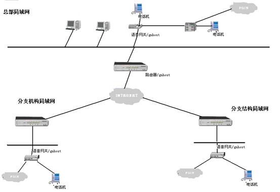 首先將VOIP電話網(wǎng)關的網(wǎng)絡接口接入到公司和分部(分公司)的局域網(wǎng)中,通過ADSL、ISDN、撥號上網(wǎng)等方式,同連接在此因特網(wǎng)上的其它VOIP電話網(wǎng)關相連,從而將不同地域的電話連接在一起,組成整個公司的IP電話網(wǎng),如果總部或分部有用戶程控交換機,還可以將VOIP電話網(wǎng)關接入程控交換機,使得整個交換機的分機都能利用IP網(wǎng)絡撥打免費電話。如果這個VOIP設備具有PBX的功能。那么電話網(wǎng)關的多種接口還可以與電信(PSTN)相連,從而將專網(wǎng)的IP電話語音網(wǎng)與整個公網(wǎng)銜接成一個大的電話網(wǎng)絡。