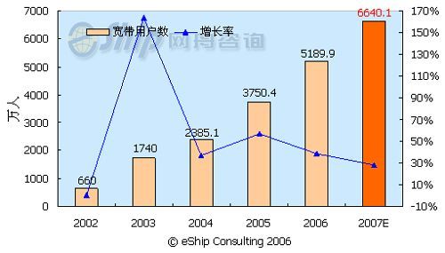 從圖中可以看出,中國(guó)的寬帶用戶數(shù)保持了快速的發(fā)展勢(shì)頭,從2002-2007年年均增長(zhǎng)率為58.7%,至2007年,國(guó)內(nèi)的寬帶用戶數(shù)將達(dá)到6640.1萬(wàn)。