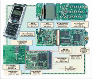 Wi-Fi功能由科勝訊(Conexant)的Prism3 802.11b芯片組完成,是一款傳統(tǒng)的專業(yè)方案。科勝訊通過收購GlobeSpan-Virata得到Prism3 802.11b,而GlobeSpan-Virata之前購買了Intersil的Wi-Fi芯片組業(yè)務(wù),所以Prism3組件仍打著Intersil的標(biāo)識。以目前的標(biāo)準(zhǔn)看,Prism3總體Wi-Fi方案的集成度不算太高。ISL3871基帶/媒體存取控制芯片與ISL3684收發(fā)器相連,一款獨立的壓控振蕩器和一個RF功放(ISL3084和ISL3984)共同支持ISL3684完成工作。適中的256KB SRAM和128KB閃存滿足該設(shè)計中802.11b部分對存儲器的需要。