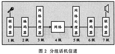 ——無論對于實時的應(yīng)用(如IP電話)還是非實時的應(yīng)用(如語音郵件),發(fā)送端語音都要經(jīng)過模擬信號—數(shù)字信號—語音包的處理過程,并在接收端對語音包進行相反的處理,從而得到與輸入端相同的語音信號。由圖2可見,每個語音流從信源(話筒)到信宿(揚聲器)就像通過一條管道,這條管道包括許多級,每一級代表一些特有的語音包處理過程。