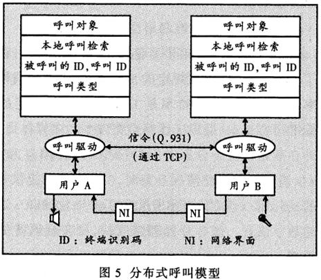 ——IP電話采用分布式的呼叫模式。因為不需要通過電路交換完成呼叫,所以每個終端都使用了呼叫處理器。單工呼叫模式僅支持一個終端的呼叫,且需要本地呼叫驅(qū)動的支持。通過觸發(fā)本地呼叫驅(qū)動軟件建立一次呼叫,而呼叫驅(qū)動利用傳輸控制協(xié)議(TCP)的套接字(Socket)與另一端的呼叫驅(qū)動建立信令連接,從而觸發(fā)另一端的單工呼叫。這兩個單工呼叫被觸發(fā)后按照Q.931信令協(xié)議完成呼叫過程的建立。根據(jù)信令的引導,呼叫驅(qū)動程序啟動語音信息流接入網(wǎng)絡(luò)和對端的接收設(shè)備,建立一個完整的呼叫過程(圖5)。圖5中的呼叫對象指明本次呼叫的域名、兩端的終端識別碼(ID)或電話號碼、呼叫類型(如單純語音、語音和數(shù)據(jù))等信息。