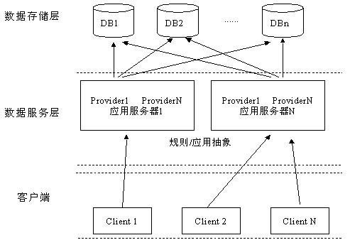 在大規(guī)模系統(tǒng)中,為保證數(shù)據(jù)庫訪問的效率和安全性,數(shù)據(jù)訪問方式一般采用由Client、中間層應用服務器(或叫規(guī)則服務器)和Server組成的三層Client/Server結(jié)構(gòu)。將數(shù)據(jù)庫應用劃分為邏輯上的三個層次,客戶程序只關心數(shù)據(jù)的顯示與用戶界面;應用服務器處理客戶數(shù)據(jù)查詢與更新請求,可在應用服務器上定義數(shù)據(jù)操作規(guī)則以保證數(shù)據(jù)操作的合法性、安全性與有效性。在三層結(jié)構(gòu)下,方便了軟件的修改和模塊的疊加,客戶端通過應用服務器訪問數(shù)據(jù)庫服務器,客戶端并不直接與數(shù)據(jù)庫服務器建立連接,從而減輕了數(shù)據(jù)庫服務器的壓力,提高整個應用系統(tǒng)的運行效率。