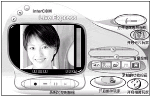 動(dòng)態(tài)視頻EMAIL,用這個(gè)軟件可以采用發(fā)送電子郵件的方式,將您的音容笑貌傳送到親朋好友的郵箱中,讓遠(yuǎn)方的她收到可“動(dòng)”的你。我們還是以?shī)W美嘉公司的CD370電腦相機(jī)為例向大家介紹這個(gè)功能。在CD370附帶的驅(qū)動(dòng)光盤中就搭載了視頻EMAIL的制作軟件,其實(shí)它是Intercom的Live Express視頻應(yīng)用軟件,除了視頻EMAIL(郵件玩家)的功能外,它還具有“卡片玩家”及“相薄玩家”等功能,我們將在以后的文章中為大家逐一介紹。首先,打開Live Express的主程序“影音玩家”,可以見到程序界面上分布著大大小小不同的按鈕,是不是一時(shí)間找不到感覺了?不用著急,下面請(qǐng)跟著我的步驟來操作: