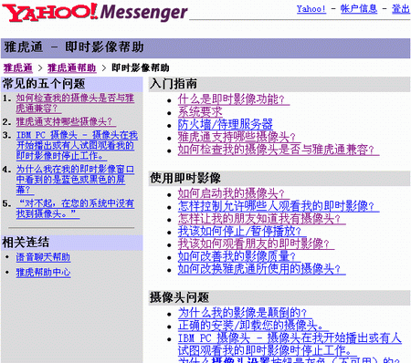 選擇工具->開啟我的攝像頭后,就會(huì)彈出“我的即時(shí)影像”窗口(圖4),如果你的攝像頭安裝連接正常,可以馬上從這個(gè)窗口中看到你的影像;如果你的攝像頭正常,但在窗口中卻沒有看到影像,你可以在聯(lián)網(wǎng)的情況下選擇當(dāng)前窗口中的幫助->即時(shí)影像幫助進(jìn)入相關(guān)網(wǎng)頁(圖5)對(duì)你的攝像頭進(jìn)行雅虎通的兼容性測(cè)試,或者尋求更為詳細(xì)的幫助。
