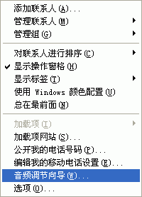 同樣,首先你應(yīng)該在MSN Messenger中調(diào)節(jié)你的音頻和視頻設(shè)備。選擇工具->音頻調(diào)節(jié)向?qū)?圖8)就會(huì)彈出“音頻和視頻調(diào)諧向?qū)А钡拇翱?圖9),請(qǐng)根據(jù)這個(gè)向?qū)У奶崾荆徊揭徊竭M(jìn)行測(cè)試和調(diào)節(jié)。