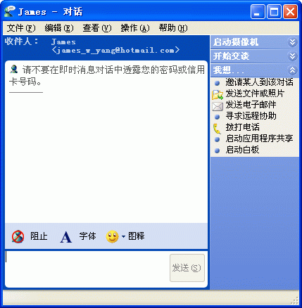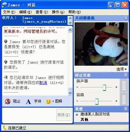 在對(duì)你的音、視頻設(shè)備檢查無誤、調(diào)試完畢后,恭喜你!你可以馬上給你的朋友打可視電話了。點(diǎn)擊在線好友的Yahoo! ID,就會(huì)彈出一個(gè)訊息發(fā)送框(圖6),在菜單欄下面的幾個(gè)按鈕中有“視頻”和“語音”兩個(gè)按鈕。沒錯(cuò)!就是它們了,點(diǎn)吧!點(diǎn)擊“視頻”按鈕后彈出了剛才的“我的即時(shí)影像”窗口;點(diǎn)擊“語音”按鈕后,訊息發(fā)送框中間部分會(huì)多出一條語音顯示和控制的狀態(tài)欄。(見圖7)對(duì)方只需右鍵單擊朋友列表中你的Yahoo! ID,并選擇“觀看即時(shí)影像”即可看到你的影像并同時(shí)聽到你的聲音。OK,開始你們愉快的交流吧!:)
