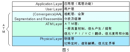 ATM層和OSI模型不完全一致,它主要處理物理層和數(shù)據(jù)鏈路層問(wèn)題,其協(xié)議分層如下圖5所示,其中簡(jiǎn)要地列出了各層的中英對(duì)照和相應(yīng)的功能。