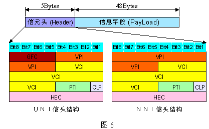 ATM信元實(shí)際上就是分組,為區(qū)分X.25分組(Packet)改稱(chēng)為信元(Cell)。ATM信元具有固定的長(zhǎng)度,總長(zhǎng)為53字節(jié)。其中前5個(gè)字節(jié)為信頭(Header),包含各種控制信息,包括信元目的(邏輯)地址、糾錯(cuò)碼、業(yè)務(wù)控制和維護(hù)信息等;后面48字節(jié)為信息字段(Payload),又稱(chēng)凈荷,其中包含了業(yè)務(wù)的數(shù)據(jù),它們將被透明地傳輸。信元結(jié)構(gòu)如下圖6所示。在UNI接口和NNI接口上ATM的信元頭結(jié)構(gòu)是不同的。