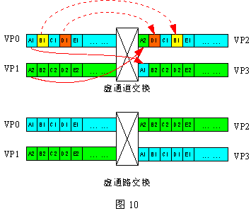 ATM中的兩種交換:虛通道交換(VCS:Virtual Channel Switching)和虛通路交換(VPS:Virtual Path Switching)。前者指同一個(gè)VP內(nèi)或不同VP內(nèi)的VC之間的交換;后者指一個(gè)VP內(nèi)所有信元同時(shí)被映射到另一個(gè)VP內(nèi)的過(guò)程。見(jiàn)下圖10。