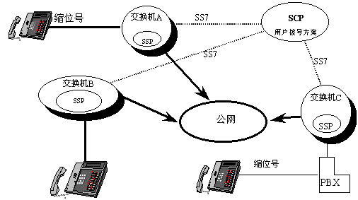 縮位撥號是指用一短的撥號(如三位)代替一長的撥號(如八位)的撥號方案。如下圖所示的智能網(wǎng)中,交換機A、B、C所有用戶的撥號方案數(shù)據(jù)都由SCP管理,當交換機收到用戶的縮位撥號后,通過SS7鏈路訪問SCP數(shù)據(jù)庫,返回對應(yīng)的電話號碼,然后交換機通過公網(wǎng)把呼叫接通到該電話號碼,就和用戶直接撥打該電話號碼一樣。
