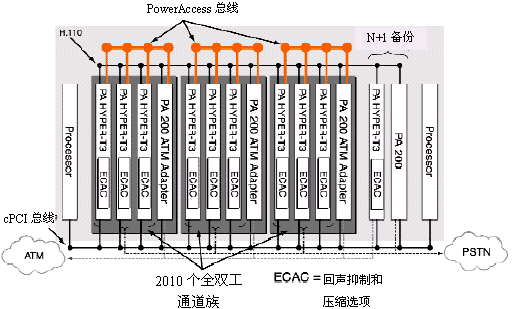 為了解決CompactPCI的這一限制,NMS開(kāi)發(fā)出了PowerAccess體系結(jié)構(gòu),它借助現(xiàn)有的CompactPCI標(biāo)準(zhǔn),同時(shí)把它的通道容量擴(kuò)展到2048之上。這種體系結(jié)構(gòu)以PowerAccess總線(xiàn)為特色,PowerAccess總線(xiàn)是一個(gè)輔助的4096個(gè)TDM時(shí)隙,支持現(xiàn)存的CompactPCI H.110總線(xiàn)。由于提供語(yǔ)音通道的增多,從而可以提高系統(tǒng)的密度。