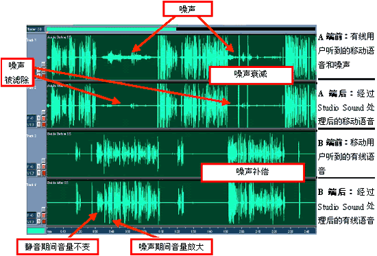 這里的結(jié)果顯示出,PSTN側(cè)收聽器接收到的噪音是如何被大大降低的,同時(shí)PSTN側(cè)說話的音量在無線側(cè)出現(xiàn)大聲的噪音期間被顯著地放大了。通過遍及全球的類似場(chǎng)合試驗(yàn),在應(yīng)用Studio Sound之前和應(yīng)用之后通話質(zhì)量的不同已經(jīng)深刻為許多業(yè)務(wù)提供商所了解。