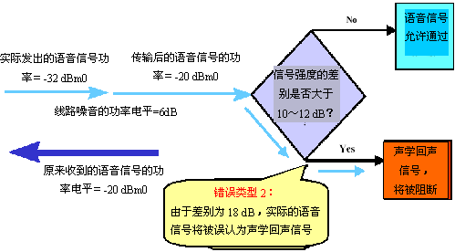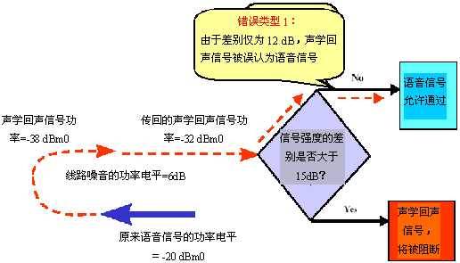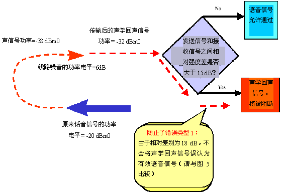 當(dāng)通信鏈路的的另一端被設(shè)計(jì)為傳輸可變強(qiáng)度的信號(hào)時(shí),"錯(cuò)誤類(lèi)型1"的影響會(huì)急劇增大。在這種情況下,根據(jù)功率電平的絕對(duì)差異來(lái)決定阻斷/允許信號(hào)的聲學(xué)回聲控制器會(huì)增大"錯(cuò)誤類(lèi)型1"出現(xiàn)的可能性。也就是說(shuō),使用絕對(duì)功率電平差異時(shí),將聲學(xué)回聲信號(hào)誤認(rèn)為有效語(yǔ)音信號(hào)的概率很大。