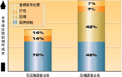 如圖4所示,是一個(gè)典型VoP系統(tǒng)大約的相對(duì)成本構(gòu)成。第一根柱圖代表無壓縮語音業(yè)務(wù),而第二根柱圖代表壓縮語音業(yè)務(wù)。這個(gè)柱形圖說明:回聲抑制和壓縮是實(shí)現(xiàn)這類網(wǎng)關(guān)的語音處理技術(shù)中成本最高的兩個(gè)功能。如果這兩種業(yè)務(wù)功能通過某一技術(shù)實(shí)現(xiàn)而能在密度和功耗方面得到一個(gè)數(shù)量級(jí)性質(zhì)的改善,那麼人人都能從中受惠。