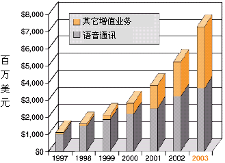 為了獲得競爭優(yōu)勢,業(yè)務(wù)提供商──傳統(tǒng)長途運營和本地交換運營商,因特網(wǎng)業(yè)務(wù)提供商(ISP),應用業(yè)務(wù)提供商,以及無線運營商──都在想方設(shè)法發(fā)布基于IP的業(yè)務(wù),這些業(yè)務(wù)應該:對用戶有較高的價值,能縮短面市所需時間,部署是低成本高效益的。向用戶提供高價值的增值業(yè)務(wù)能為業(yè)務(wù)提供商帶來重要的收入源泉,并使他們更有特色,增加市場分額,特別是如果這些業(yè)務(wù)以快速、易于支持的方式部署,以上這些優(yōu)勢就會更加突出。據(jù)估計,到2003年增值業(yè)務(wù)設(shè)備僅在美國就能達到73億美元的市場,正如圖1所示。
