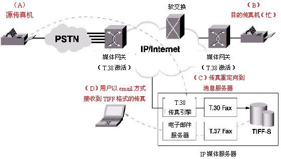 T.38規(guī)定了實時IP傳真的標準。因此,源于PSTN的一個傳真會話能夠以T.38的格式進入IP網(wǎng)絡(luò)。在IP媒體服務(wù)器中通過使用T.30,T.38和T.37,實時傳真會話可以把IP媒體服務(wù)器作為終端,并把實時傳真轉(zhuǎn)換成T.37兼容的傳真消息。然后,這個傳真消息會被用來產(chǎn)生一個就象一個電子郵件會話的T.37傳真。這使得IP媒體服務(wù)器可以提供"永不示忙"的IP傳真功能。這個功能也將為統(tǒng)一消息應用提供基于IP的傳真郵箱能力。