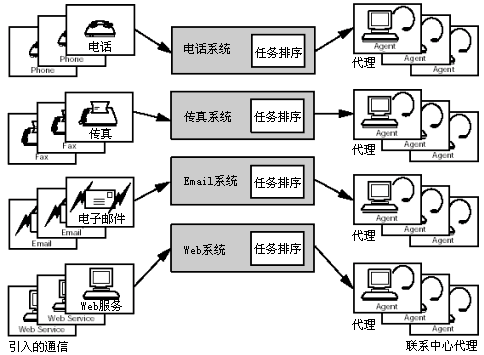 傳統(tǒng)上,每一個(gè)通信子系統(tǒng)都有自己的負(fù)載排序模塊。電話系統(tǒng)有一個(gè)ACD模塊,它負(fù)責(zé)依據(jù)其自身預(yù)編程的邏輯排序、分配語(yǔ)音呼叫;傳真系統(tǒng)處理請(qǐng)求的方式是不同的;電子郵件系統(tǒng)使用另一種方法來(lái)保證郵件的順序及其可靠的獲取。與此同時(shí),網(wǎng)絡(luò)服務(wù)器有其特定的方法來(lái)跟蹤、報(bào)告客戶(hù)點(diǎn)擊Web頁(yè)面上的鏈接后發(fā)出的回叫請(qǐng)求。這些接口使用不同的方式進(jìn)行工作,而且如果使用三種獨(dú)立的排序方式,那么在業(yè)務(wù)請(qǐng)求到達(dá)聯(lián)系中心代理時(shí),將會(huì)產(chǎn)生優(yōu)先級(jí)的沖突。當(dāng)使用多個(gè)獨(dú)立的隊(duì)列時(shí),并不存在哪種能夠使負(fù)載以一種協(xié)調(diào)一致的方式進(jìn)行分配的集中的排序方式。參見(jiàn)圖1。